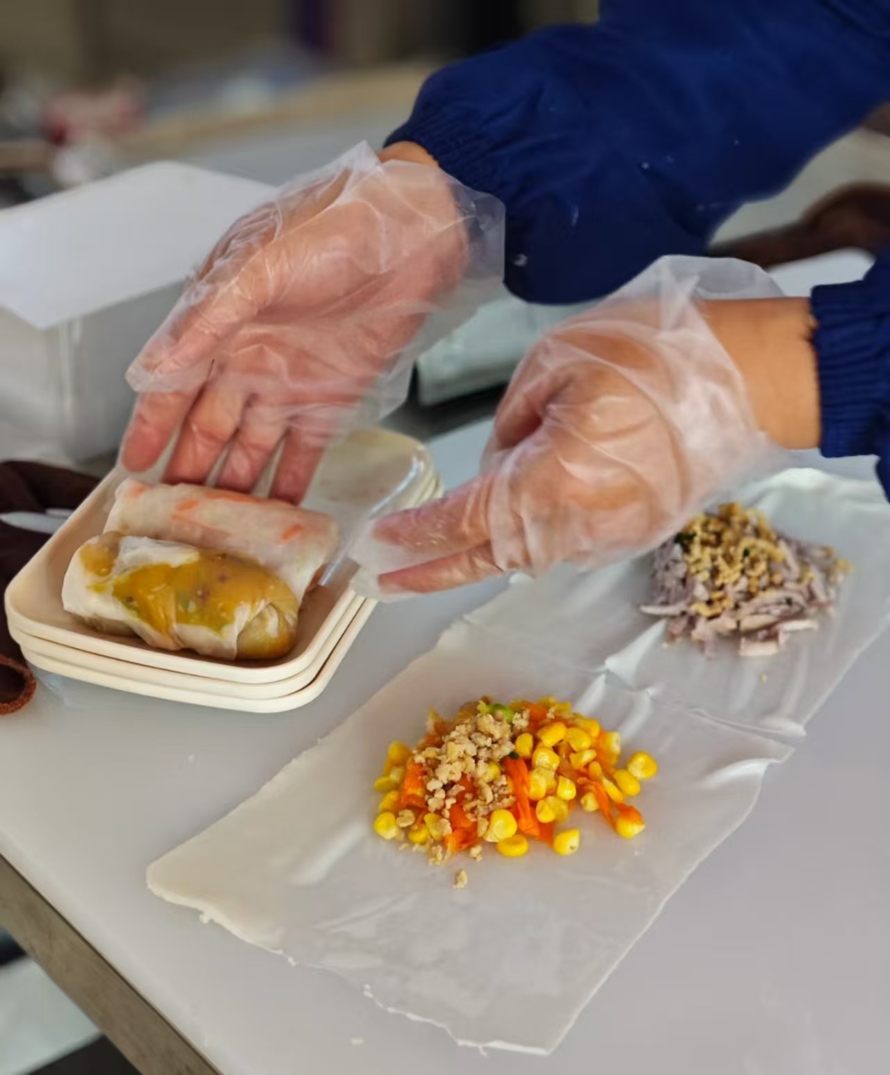 - 捆制手法教學(xué):將米皮平鋪在案板上,均勻鋪放餡料(約 30 克,避免堆積在中心),從一端開始卷捆,力度適中(確保緊實(shí)不松散,又不壓破米皮),卷制長(zhǎng)度控制在 10 厘米左右,兩端壓實(shí),避免餡料外露;